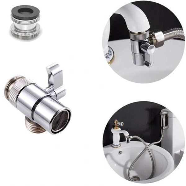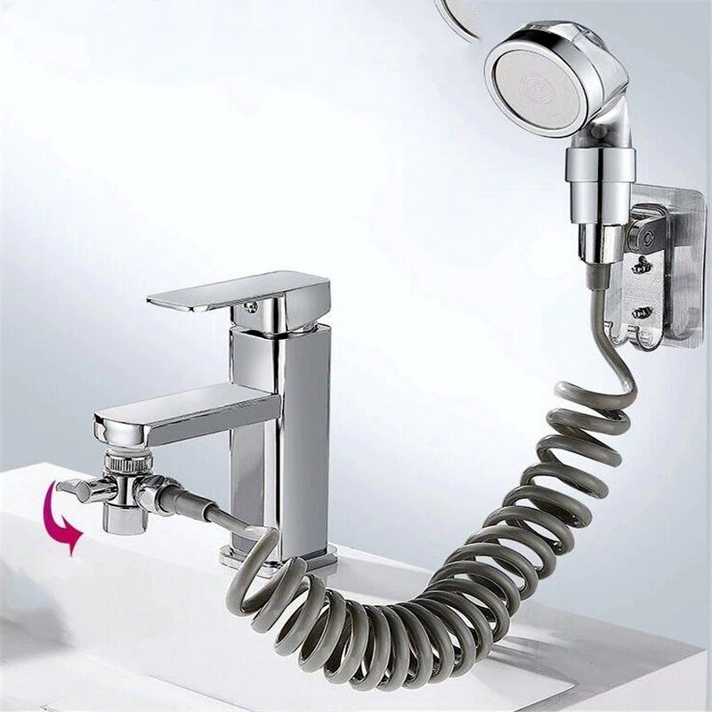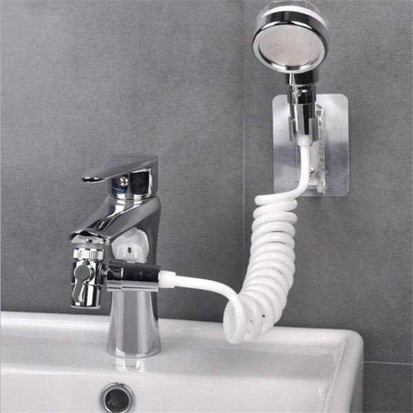 Извадете крана на мивката и инсталирайте нов вентил с три изхода. Поставете маркуч, свързан към държача за душ, на стената в страничния изход. Пакетът включва и държач за монтиране на стената и поставяне на дръжка в нея. Долната част на клапана обаче е предназначена за нормална течаща вода, течаща от крана. Инсталирането на удължител за вода в банята не влияе на струята вода, идваща от обикновен кран.
