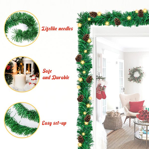 Със своята здрава конструкция и ярки, устойчиви на избледняване материали, нашата коледна гирлянда от бор ще краси дома ви през целия празничен сезон и в следващите години.