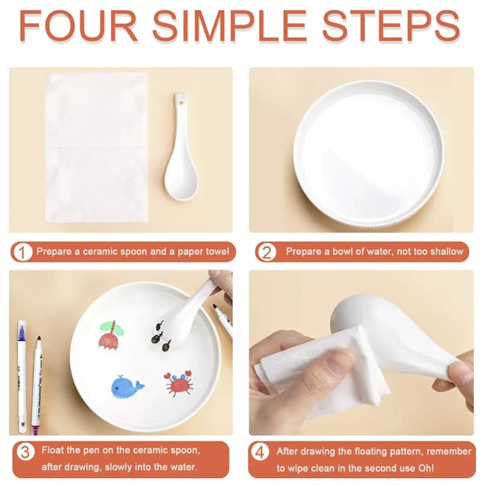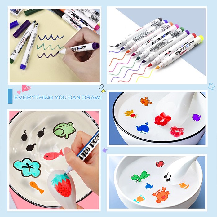 Цветната магическа химикалка е за рисуване върху дъска, рисуване с вода и всякакви различни повърхности. Подходящи са за детски графити на хартия, за писане и рисуване в лекции в клас, полезни са и за офис срещи. С тези химикалки те създават безкрайни възможности за творчество, тъй като могат да рисуват всякакви малки рибки, костенурки, делфини, цветя, пеперуди и други, които в крайна сметка пускат да се носят по водата.