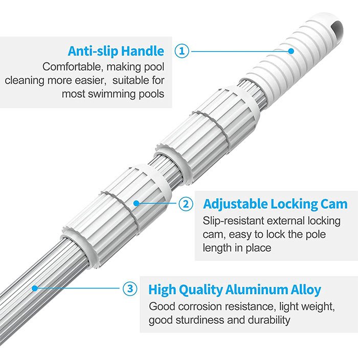 Изработена от висококачествени материали, тази пръчка за почистване на басейни е здрава, издръжлива и предназначена за тежки задачи по почистване. Удобната му дръжка улеснява маневрирането и управлението на уреда за почистване на басейни, докато леката му конструкция гарантира лесна употреба.