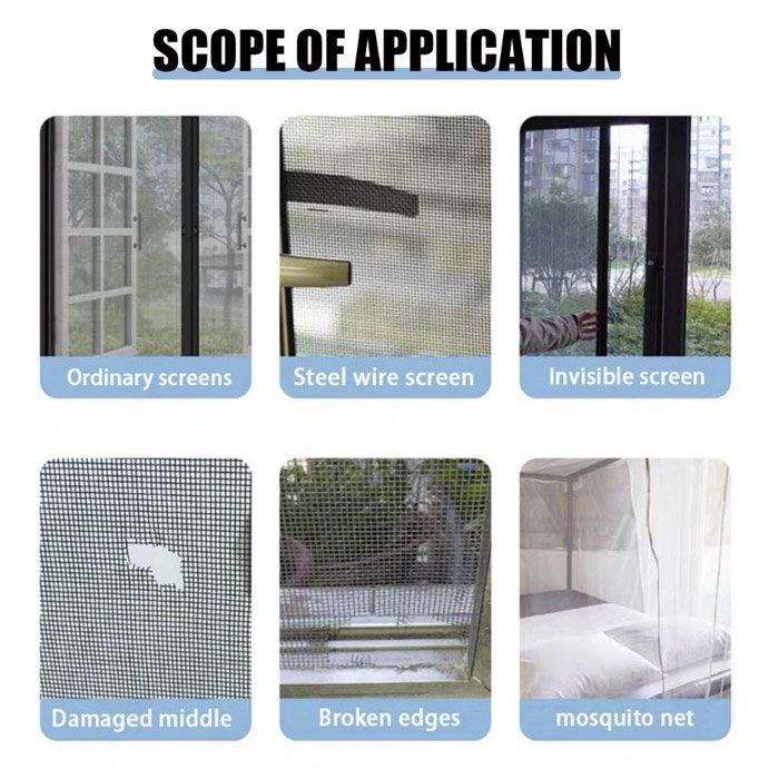 Идеален за вътрешна и външна употреба, идеален за незабавно прикриване на дупки. Нашият ремонтен комплект е подходящ и за среда с висока влажност; Поправете дупки и разкъсвания в мрежи за прозорци, мрежи за палатки, плувни басейни, паравани за автомобили и др.