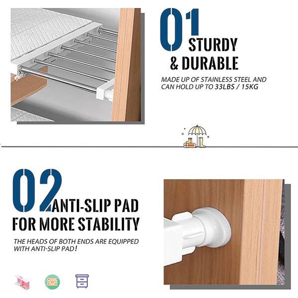 Инсталирането на Shelfy е лесно – просто настройте удължуващите пръчки, за да бъдат съобразени с размерите на вашия гардероб, и готови сте. Не са необходими инструменти или сглобяване.