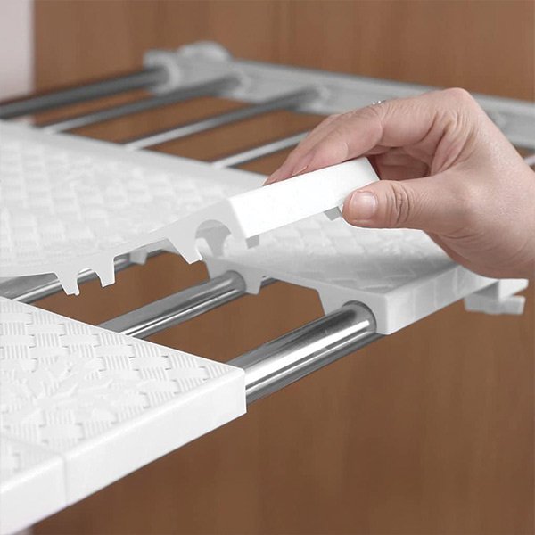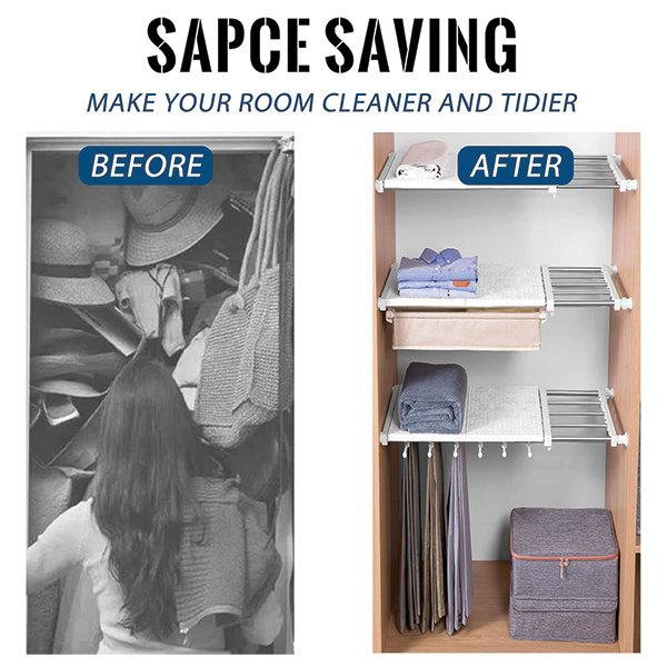 Организирайте се с Shelfy, разширяемата рафа, която мигновено добавя допълнително място за съхранение във вашия гардероб, без нужда от инструменти или монтаж.