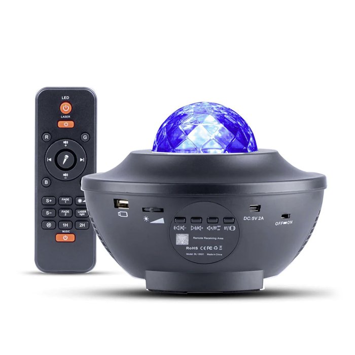 С дистанционното можете да контролирате светлината на звездния проектор, да го включвате и изключвате, така че няма да има нужда да ставате. С него можете да променяте цветовете, цветните светлини, да променяте режима на осветление, да променяте музикални песни и да настройвате таймера. Най-новият режим на мигане, активиран със звук, позволява на проекцията да променя цвета или шарките в отговор на ритъма на музиката или пляскането с ръце.