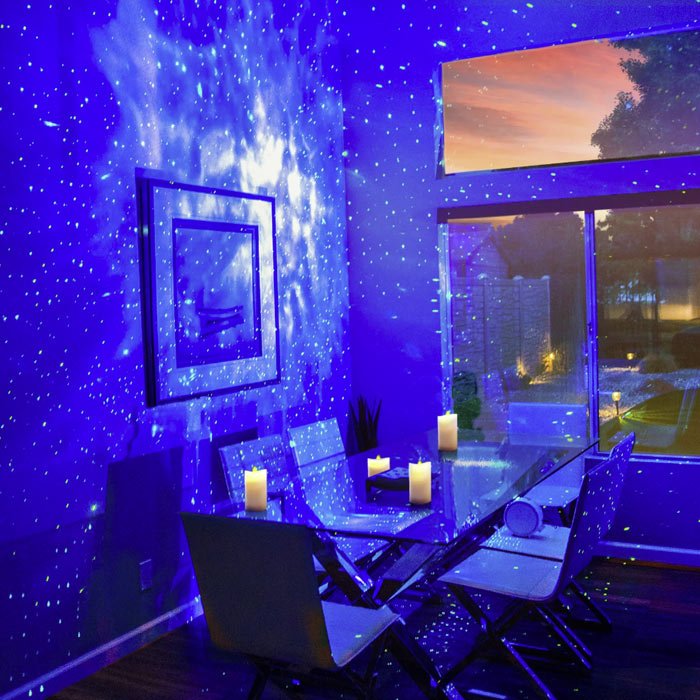 Звездният проектор може да проектира до 21 различни цвята. За да получите толкова много комбинации, 5 стандартни цвята (червено, синьо, зелено, бяло и зелена лазерна точка) се смесват един с друг. Различни цветове, комбинирани с динамична нощна прожекция с различни скорости, създават спокойна, романтична и цветна и забавна атмосфера в стая с красива звездна светлина.