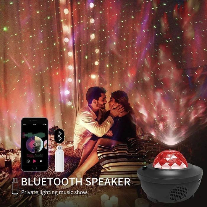 Можете да изберете любимата си музика чрез Bluetooth или USB кабел. Добрата музика и звездните прожекции създават романтична, успокояваща или забавна атмосфера през нощта. Можете да зададете таймер, така че музиката и светлините да се изключват автоматично в определен час. Звездният проектор може да се върти на 360°, да се свързва чрез Bluetooth и да възпроизвежда Вашата музика на високоговорителите на проектора.