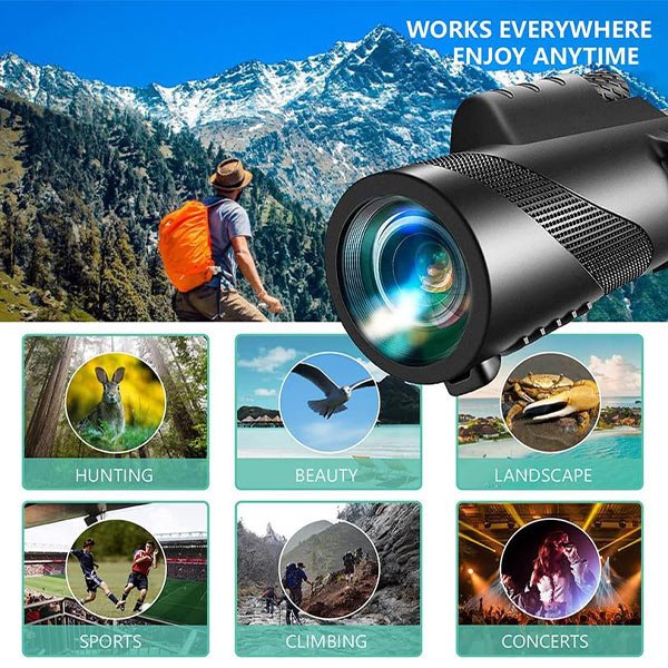 Monokularni teleskop za telefon - Telescopy е високорезолюционен зуум обектив, проектиран за подобряване на вашите фотографски умения чрез засичане на далечни обекти с прецизност. С увеличение от 12x, той лесно се поставя на камерата на телефона ви, което го прави идеален за фотографски ентусиасти, които търсят нови перспективи. Неговият устойчив на атмосферни влияния дизайн гарантира здравина по време на открити приключения.